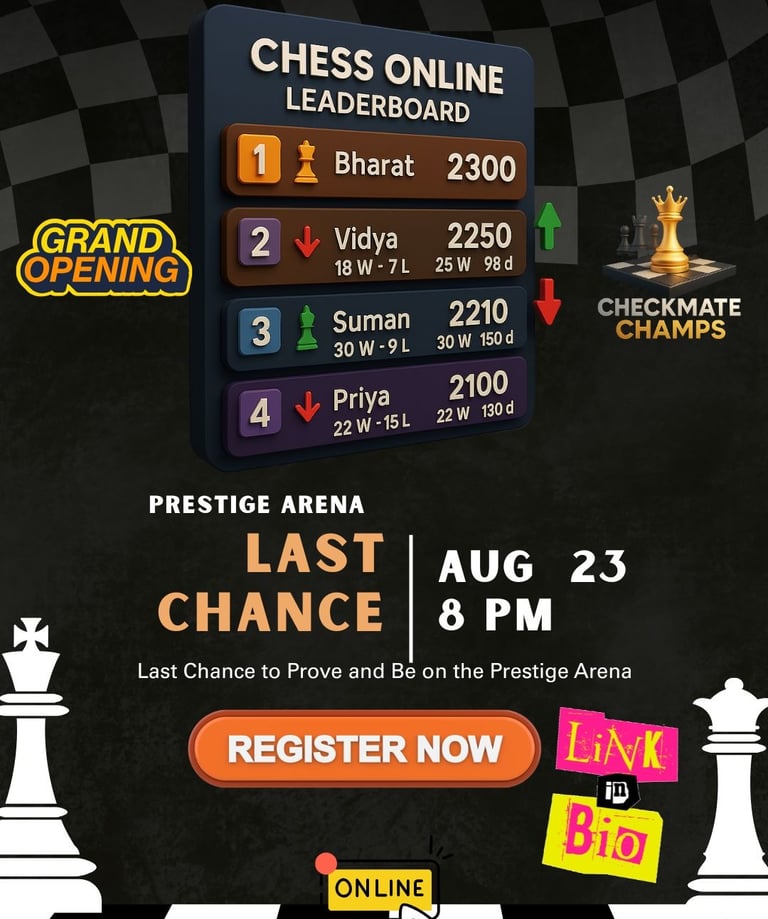 We invite you to explore, reflect, and relive the journey. Let these posters remind you of the battles fought, the minds tested, and the legacy built—one move at a time. Welcome to the visual soul of Checkmate Champs and be a part of this journey. Every member of this community is a Champ in its true sense.